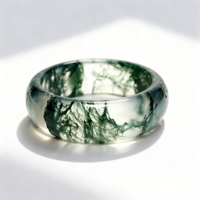 This isn’t just a ring—it’s a tiny, wearable forest frozen in stone. Crafted from natural moss crystal agate (a variety of chalcedony), its unique green dendritic inclusions mimic delicate moss or foliage, each pattern as one-of-a-kind as a wild woodland.